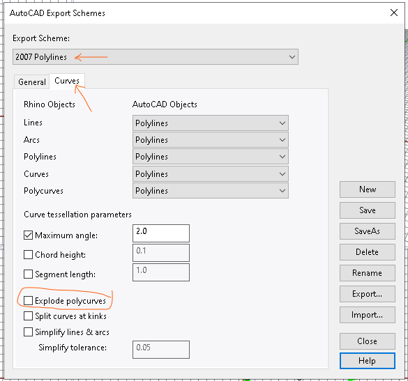 2. To export your file use the “2007 Polylines” Scheme and make sure that “Explode polycurves” unticked.