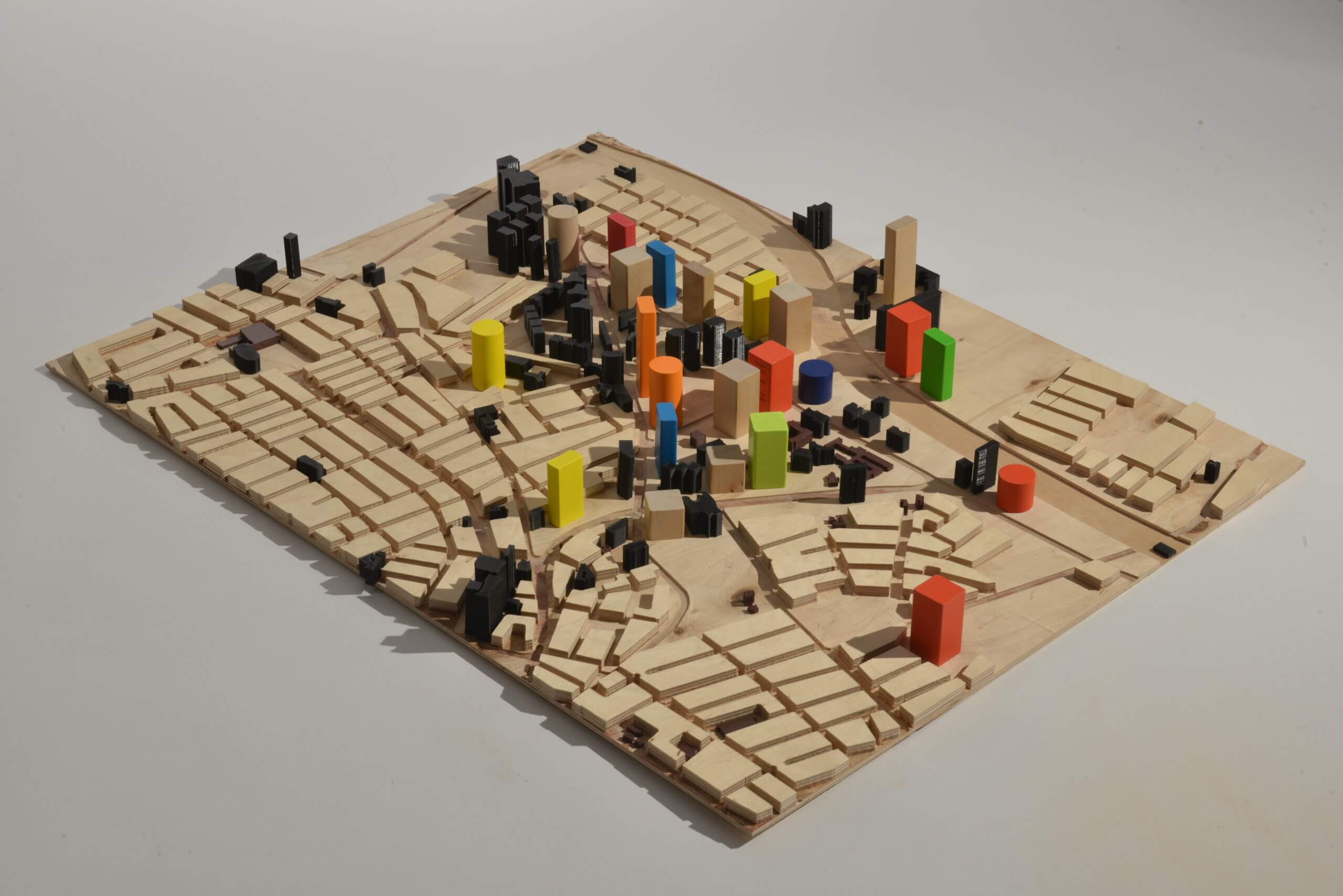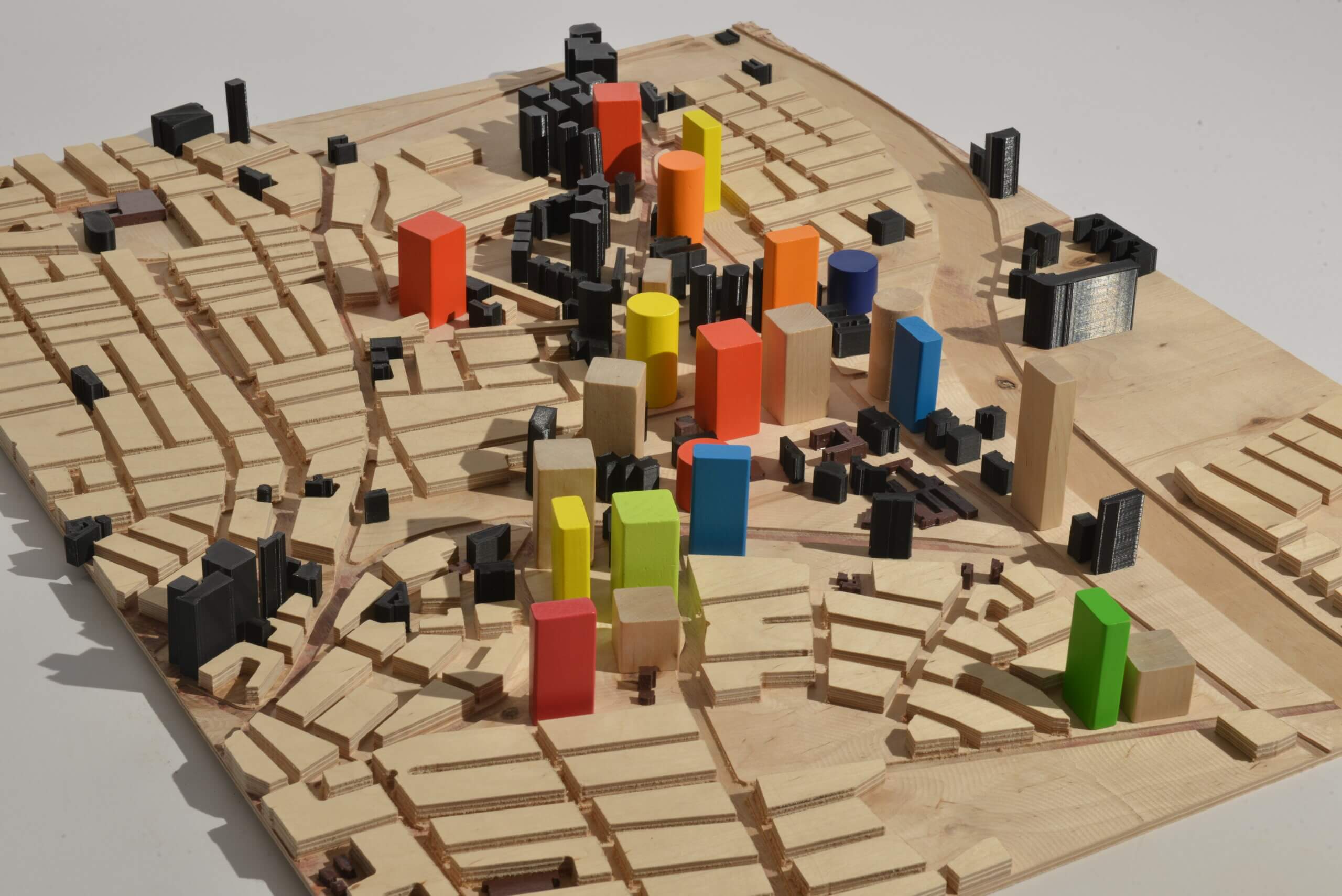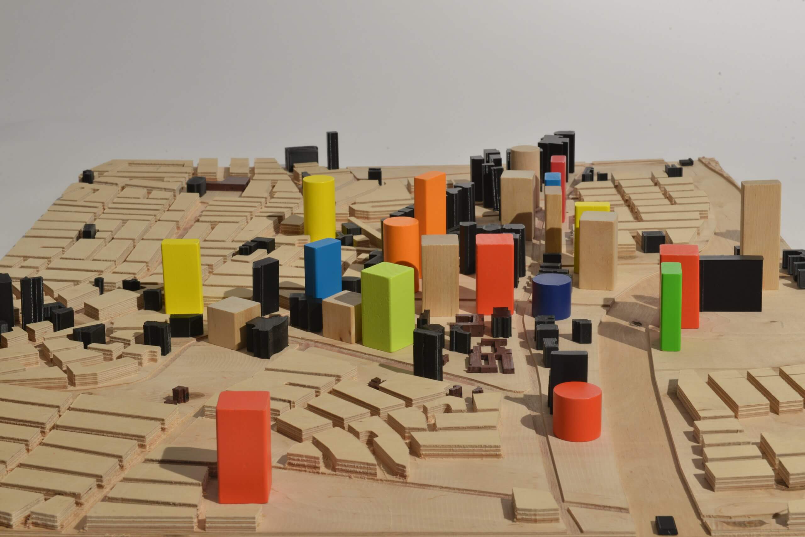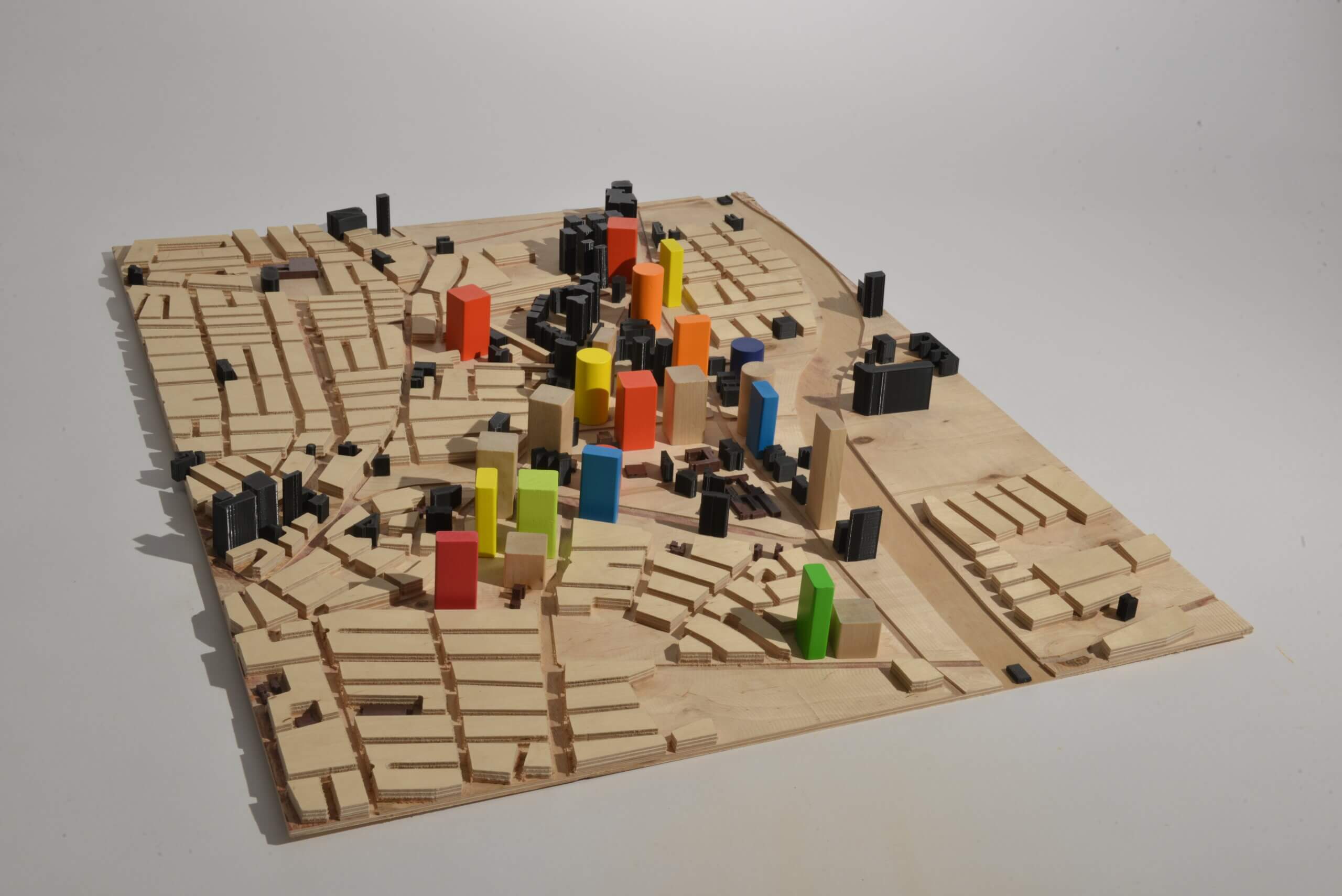 מודל בקנ”מ 1:2500. שכבת העץ אפשרה הצגה אחידה של המרקם הבנוי בעיר והבליטה את מערכת הרחובות, מבנה הבלוק וגובהו ביחס לפיתוח האינטנסיבי של מרכז העסקים המתחדש. אזורים שעתידים להשתנות ללא תכנית ידועה, נשארו חשופים כדי לאפשר הוספת נפחים דינאמית עליהם.