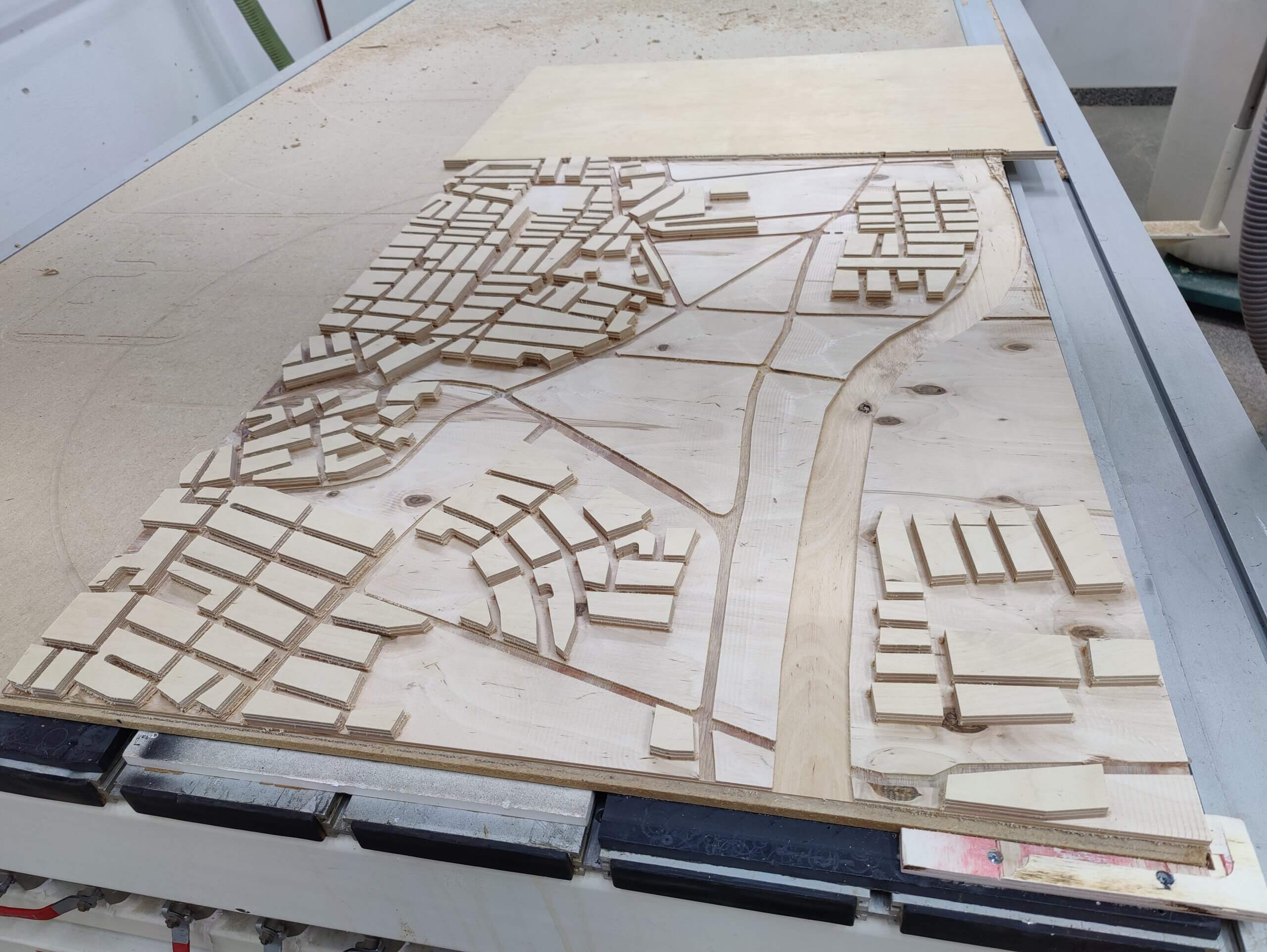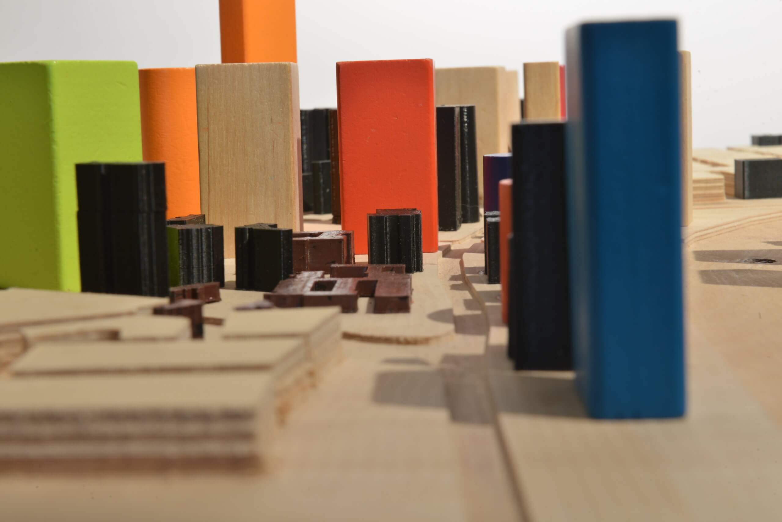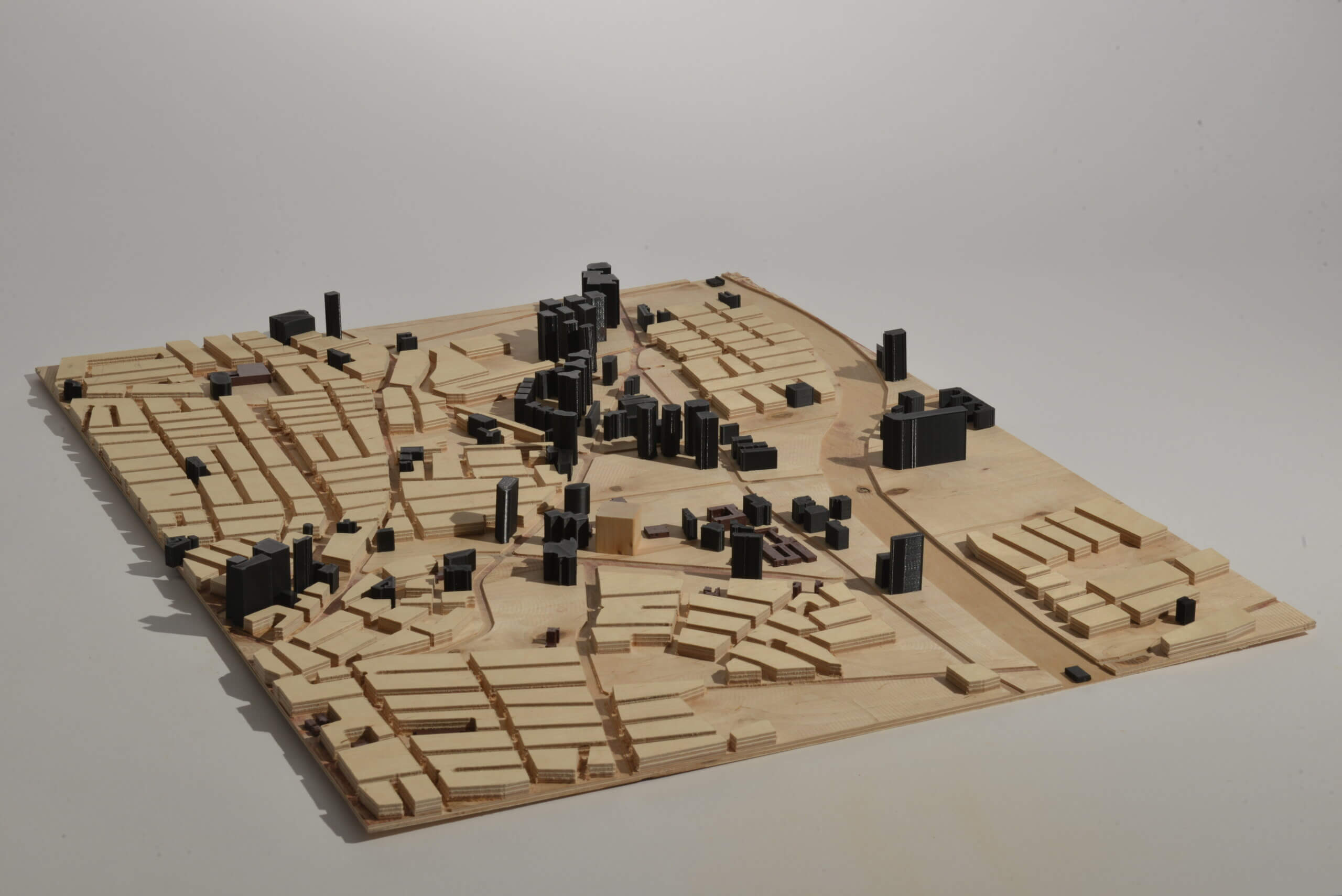 מודל בקנ”מ 1:2500. שכבת העץ אפשרה הצגה אחידה של המרקם הבנוי בעיר והבליטה את מערכת הרחובות, מבנה הבלוק וגובהו ביחס לפיתוח האינטנסיבי של מרכז העסקים המתחדש. אזורים שעתידים להשתנות ללא תכנית ידועה, נשארו חשופים כדי לאפשר הוספת נפחים דינאמית עליהם.