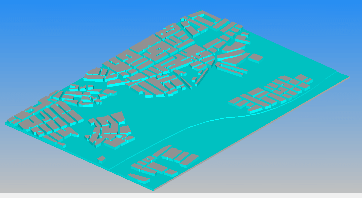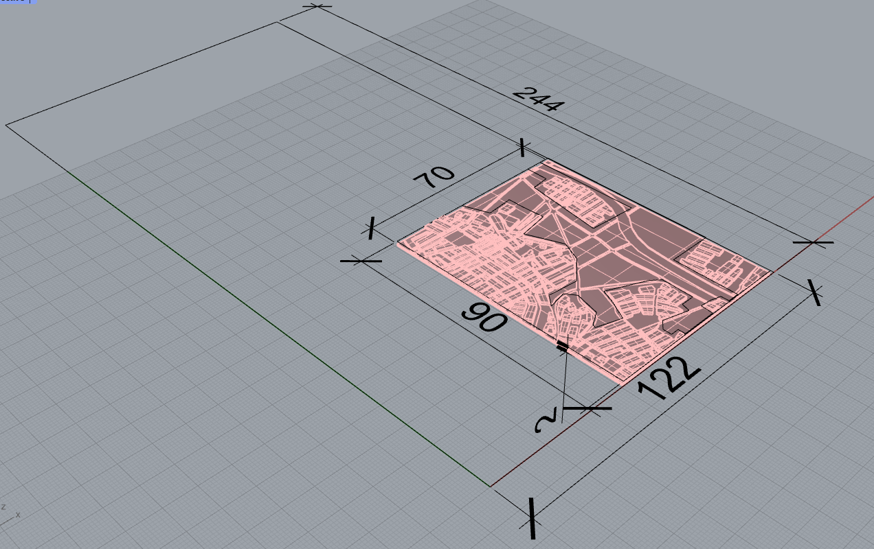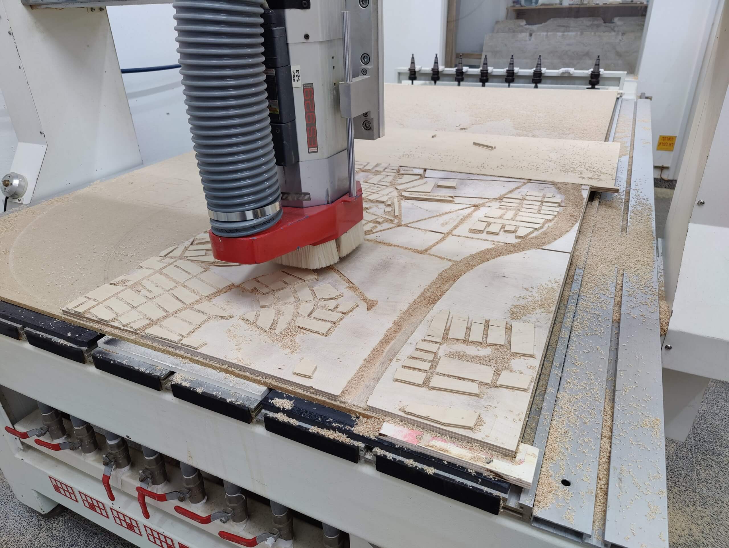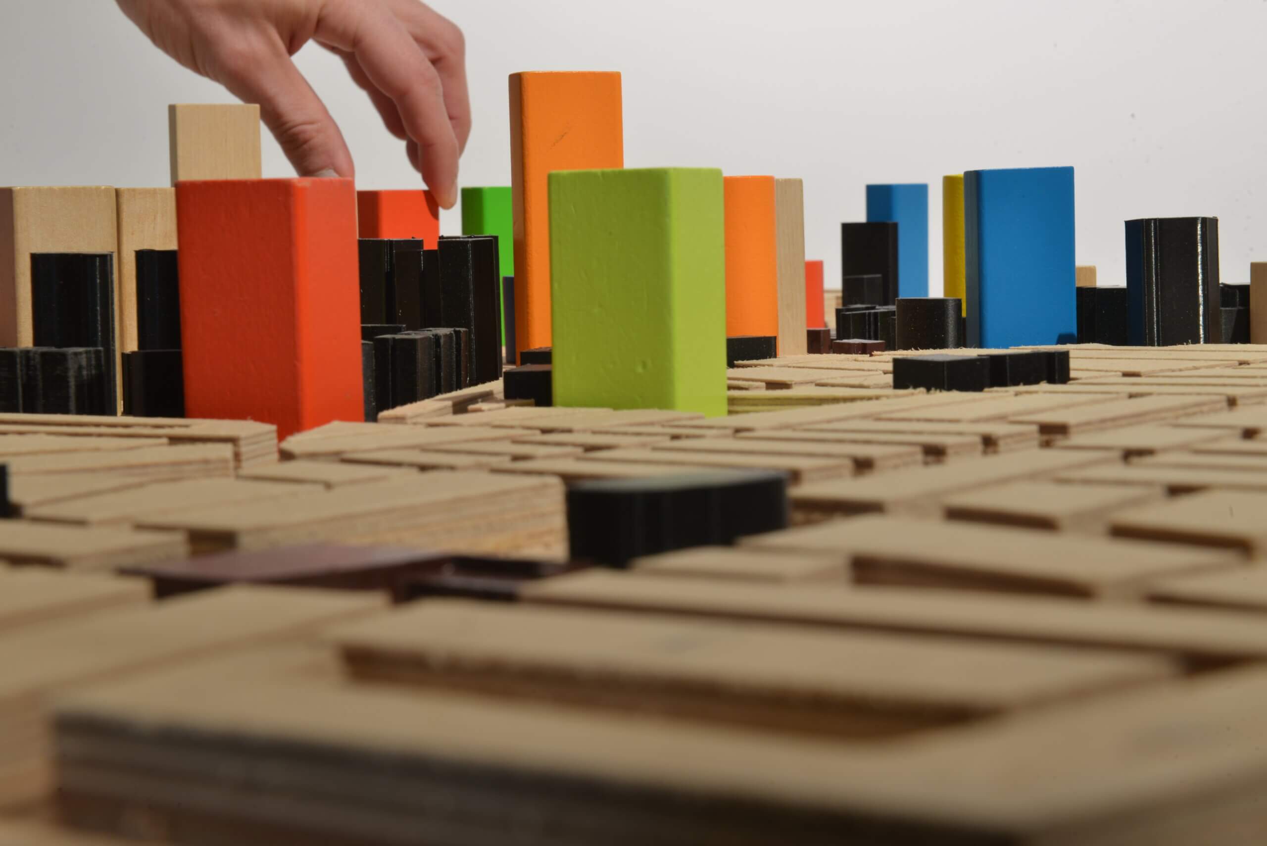 מודל בקנ”מ 1:2500. שכבת העץ אפשרה הצגה אחידה של המרקם הבנוי בעיר והבליטה את מערכת הרחובות, מבנה הבלוק וגובהו ביחס לפיתוח האינטנסיבי של מרכז העסקים המתחדש. אזורים שעתידים להשתנות ללא תכנית ידועה, נשארו חשופים כדי לאפשר הוספת נפחים דינאמית עליהם.