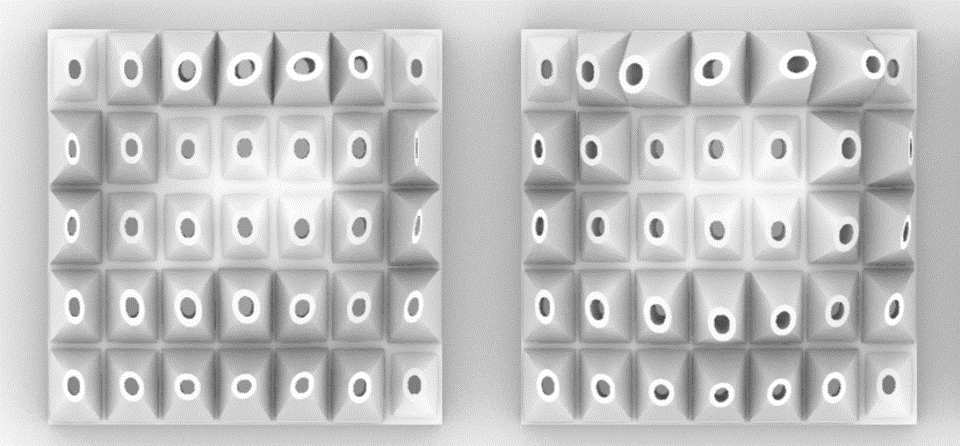 Each cell from the tile was first designed as a 3d geometry in Rhino 3D and then through grasshopper was populated onto a double curved geometry surface to create a complex 3D tile.