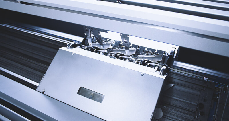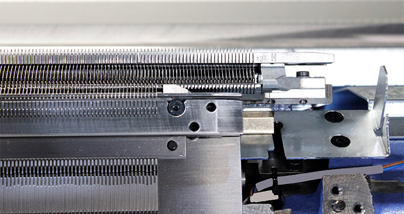 A single yarn carrier is used for all knitting techniques. Intarsia, Plating or Inlay technique can be produced in one fabric without exchanging of the yarn carriers.